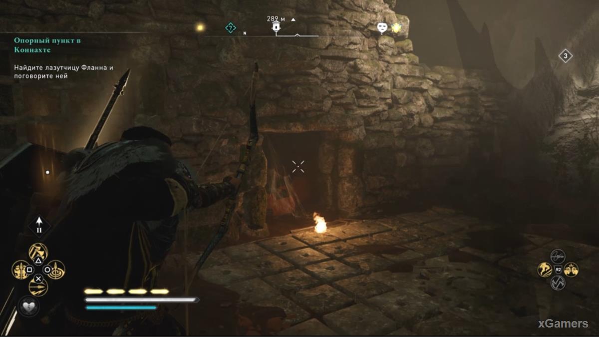 Неподалёку от «Нокфри», который вы посетили в задании «Собираясь с силами», найдите холм. Обратите внимание на камни из скриншота ниже, вход как раз за ними. Спуститесь вниз и разрушьте каменную стену способностью «Огненная ловушка». Кувшины с маслом можно найти за стеной слева, разбив сосуды и проскочив в лаз. Там же сундук с железной рудой и кожей.