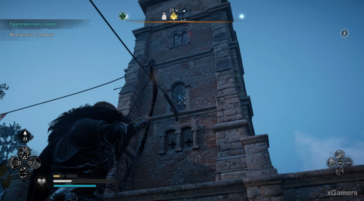 В самой башне можно увидеть хлипкий деревянный настил, выстрелите в него из лука или разбейте топором.