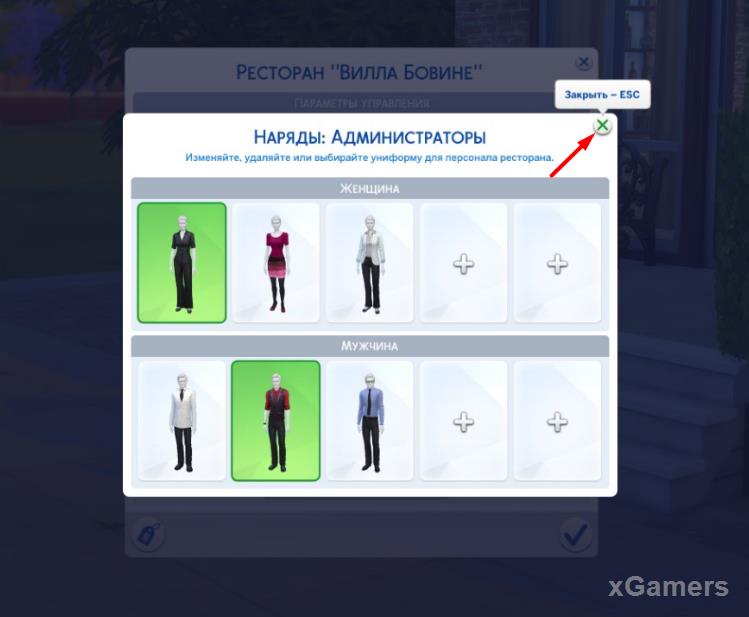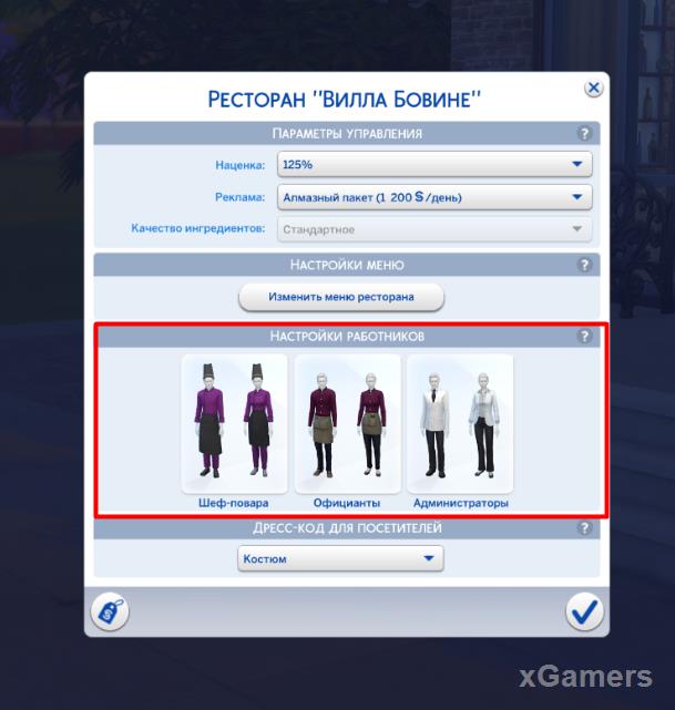 В открывшемся меню проводится настройка ресторана, от меню до внешнего вида персонала и дресс-кода гостей.