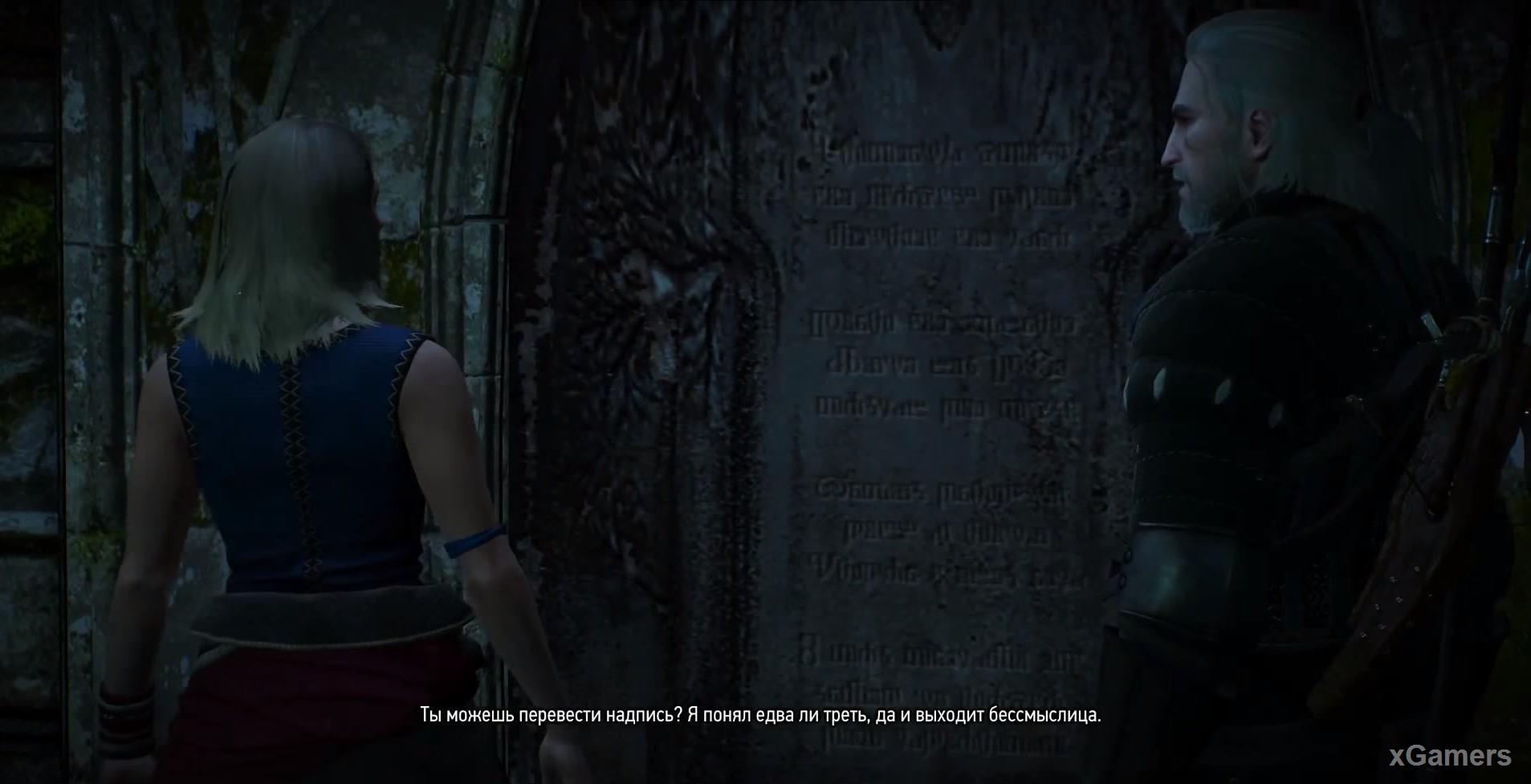 Геральт и Кейра окажутся в помещение с четырьмя статуями и с плитой, на которой написана загадка на эльфийском языке, со следующим текстом: